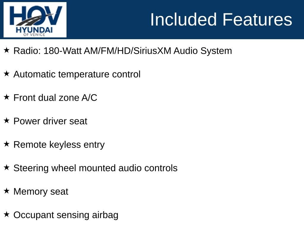 All pricing assumes dealer arranged financing on approved credit. Retired Loaner Vehicle pricing may include all factory rebates and incentives.. Hyundai of Venice Platinum Protection Plan of $1,295 and $995 CPO Inspection charge (CPO Units only) is not included. Hyundai of Venice also offers various programs periodically, which are mutually exclusive and cannot be combined with other offers. A Dealer Fee of $1299.00, Electronic Titling Fee of $599.95, Private Tag Agency fee of $298.00, and applicable taxes, tags, and government fees are not included in the listed prices. While we strive to represent each vehicle accurately, including color, equipment, and options, we recommend verifying all details before purchase, as we are not liable for errors or omissions. To receive any advertised pricing or specials, a copy of the advertisement must be presented at the time of purchase. All prices are for immediate sale and vehicles are sold first come first served. We do not accept deposits to hold used vehicles.