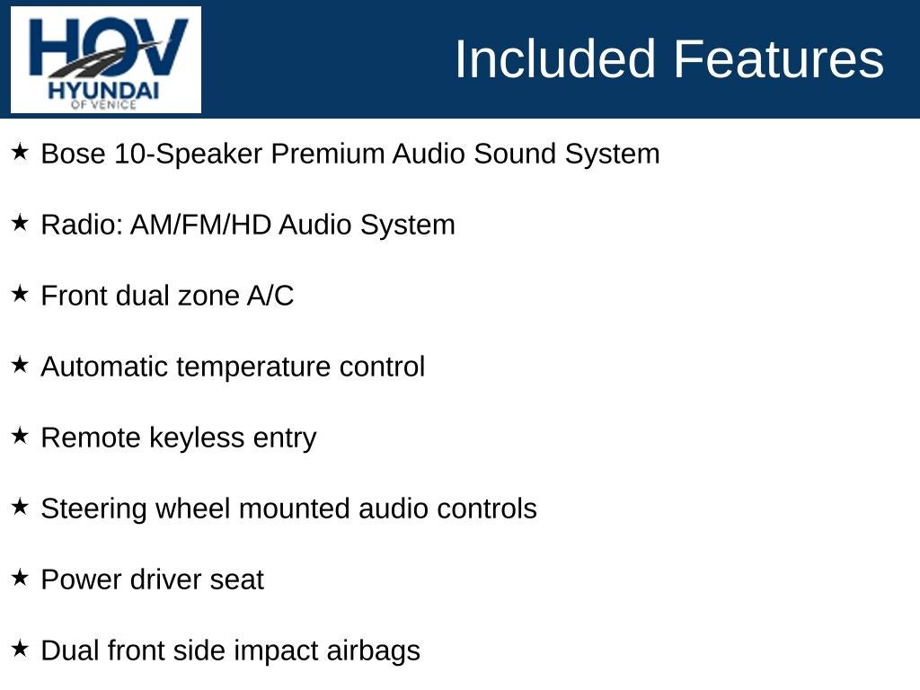 Visit our website at www.hyundaiofvenice.com for full pricing disclosures including required fees. Advertised prices exclude tax, tag, title, registration, and applicable dealer fees, including a $1,299 dealer fee, $599.95 electronic filing fee, and $298 private tag agency fee. Certain vehicles may include optional dealer-installed products or services, such as the Hyundai of Venice Platinum Protection Plan ($1,295). Certified Pre-Owned (CPO) vehicles may also include a $995 certification inspection fee. These items are not included in the advertised price unless otherwise stated and are always optional unless specifically disclosed. Some pricing may reflect available incentives or programs. Not all customers will qualify, and offers may not be combined. Please contact the dealership for complete details and eligibility requirements. While we make every effort to ensure accuracy in vehicle descriptions, pricing, equipment, and availability, we recommend verifying all information with a member of our team prior to purchase, as errors or omissions may occur. All vehicles are offered for immediate sale and are sold on a first-come, first-served basis. Due to high demand, we do not hold used vehicles with deposits. To ensure eligibility for any advertised price or promotion, please reference the specific advertisement at the time of purchase.