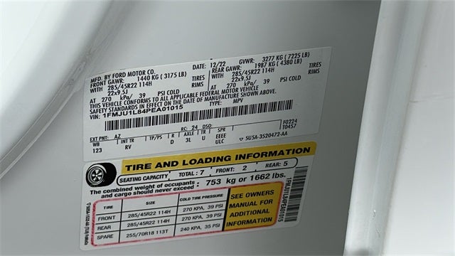 EQUIPMENT GROUP, 22 Speakers, 26mm Engine Radiator, 3.73 Axle Ratio, 360-Degree Camera w/Trailer Reverse Guidance, Automatic temperature control, Equipment Group 600A Standard Package, Exterior Parking Camera Rear, Front Dual Zone Electronic A/C, Front fog lights, Fully automatic headlights, Garage door transmitter, Genuine wood dashboard insert, Heated Steering Wheel, Heated/Cooled Front Seats, Heavy-Duty Trailer Tow Package, Integrated Trailer Brake Controller, Low Tire Pressure Warning, Power Moonroof, Pro Trailer Backup Assist, Radio: B&O Unleashed Sound System by Bang & Olufsen, Reclining 3rd Row Seat, Remote Keyless Entry, Second Row Bucket Heated Seats, Second Row Power Windows Removal, SiriusXM w/360L, Smart Power Tialgate, Split folding rear seat, SYNC 4 w/Enhanced Voice Recognition, Wheels: 22 12-Spoke Polished Aluminum.